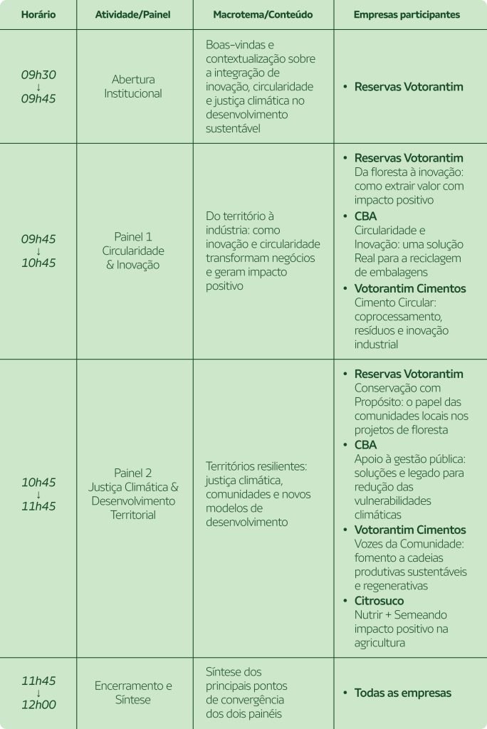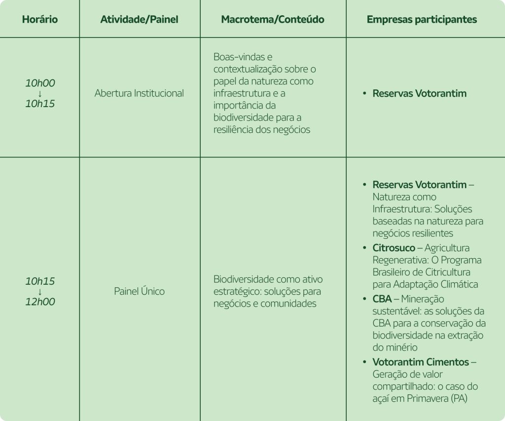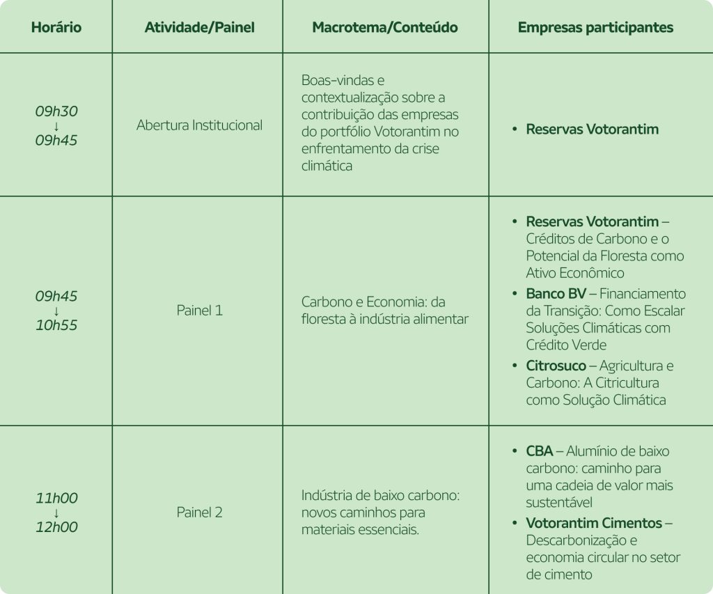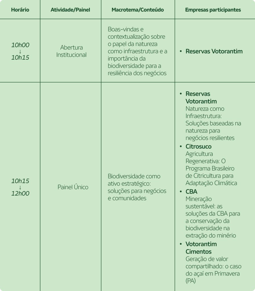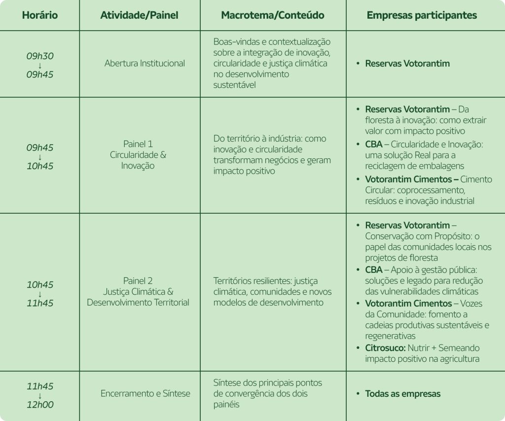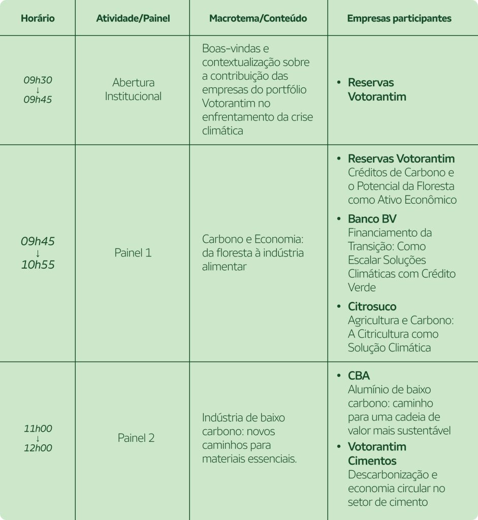 A programação reflete a essência das empresas do portfólio: negócios que se transformam para gerar valor ambiental, social e econômico, combinando inovação, biodiversidade e responsabilidade com o futuro.